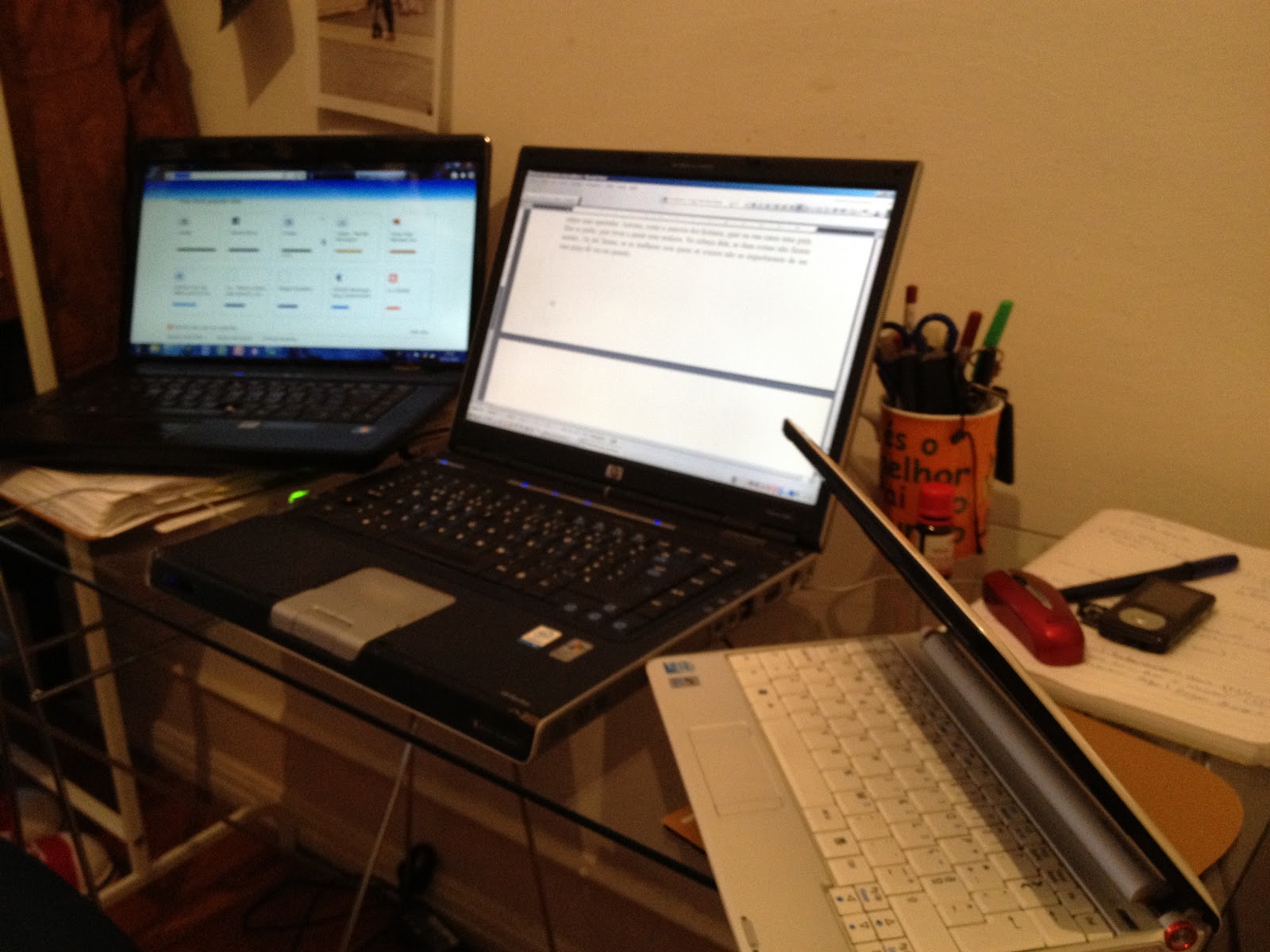 … Confesso que não tenho muito que escrever. Ou melhor, até tenho, mas como tenho escrito tanto por outros lados fica sempre o blog para último. Agora vim aqui só para desabafar, que para isso também, serve o meu blog. Mergulhei num projecto novo. Não sei se devia porque tenho pouco tempo, muito pouco tempo livre para ele, e então a maneira que encontrei de conseguir ir fazendo o que é preciso foi ligar os três computadores que tenho aqui. Não sei se é normal, aliás, acho mesmo que não é… porque hoje quando entrei no gabinete olhei e pensei, ‘Cláudio, isto não será falta de organização?!”. O pior é que eu acho que sim, reconheço que estou meio desorganizado, é como se tivesse três cérebros, no lugar dos três computadores e cada um deles tivesse uma função diferente para o mesmo objectivo: Ajudar! Estranho porque não estão a conseguir. Eu não vos disse que o melhor era não escrever nada? Também, foi só um desabafo!