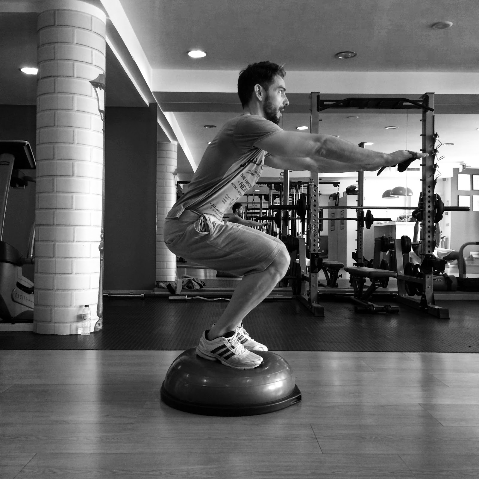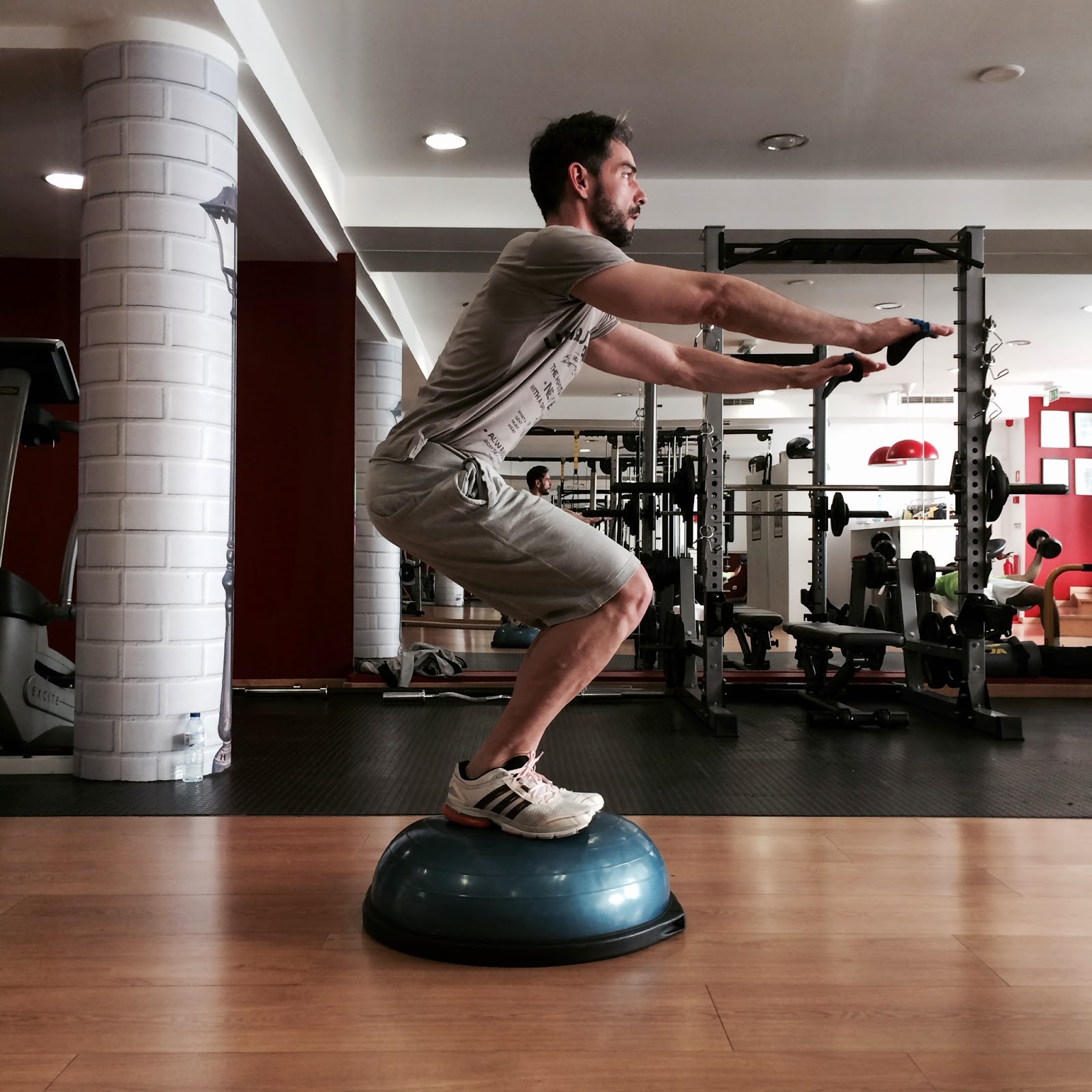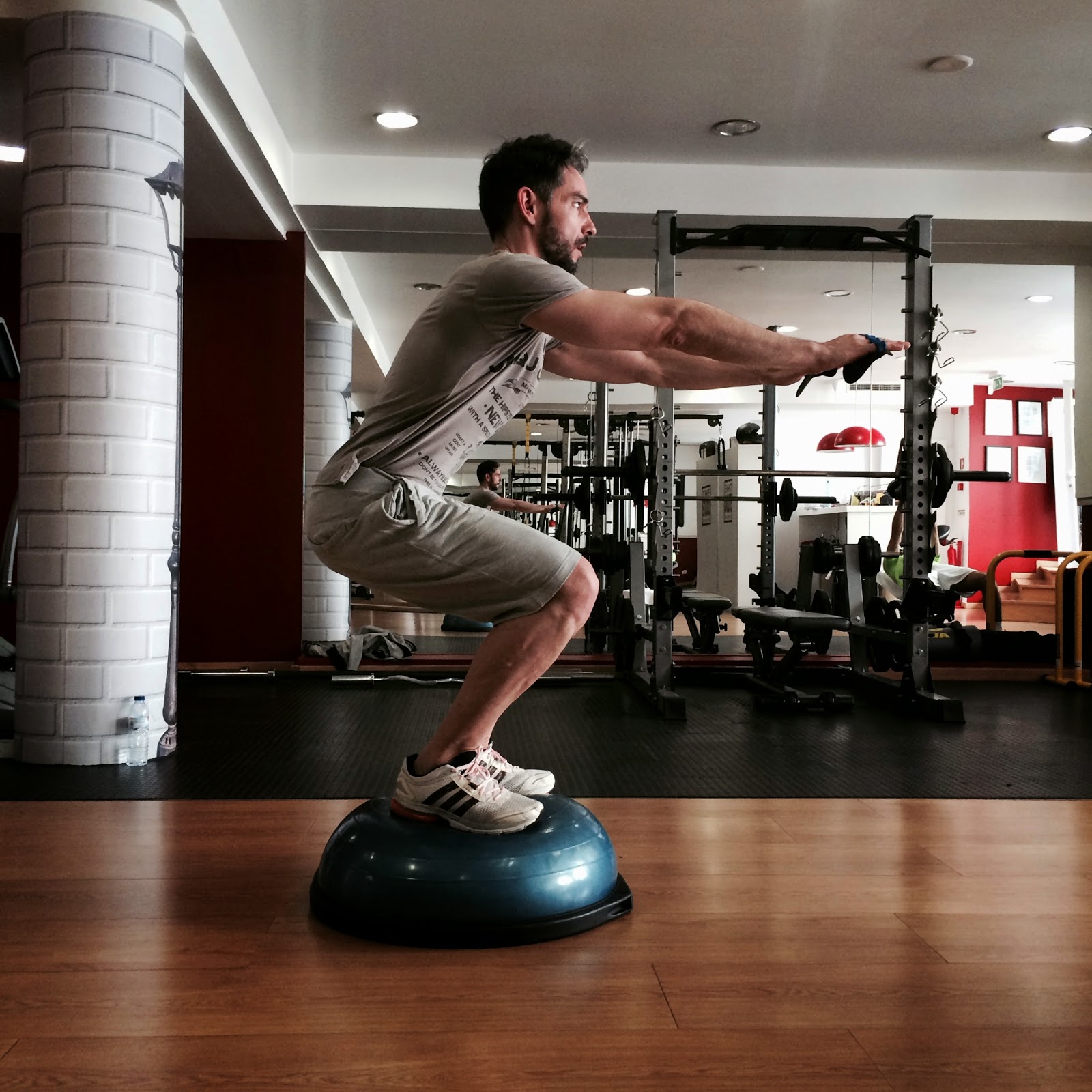 … Este exercício é difícil de fazer. Mas é óptimo para pernas, glúteos e abdominal. O objectivo é fortalecer e tonificar esses músculos e o ideal é, como mostro na imagem, manter o ombro na linha do calcanhar e o joelho na linha do cotovelo. Calma! Não precisamos exagerar que o equilibro em cima do Bozu (esta meia bola azul) é difícil. Vamos tentar aguentar assim três vezes 30 segundos cada uma. Para começar!